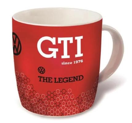 Tasse à café, avec anse, décorée du logo Golf GTI de la marque VW Volkswagen sur fond rouge.