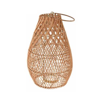 Lanterne en forme de cône de couleur naturelle faite en rotin joliment noué. A l'intérieur de la lanterne se trouve un support en métal avec un récipient en verre pour la bougie.
