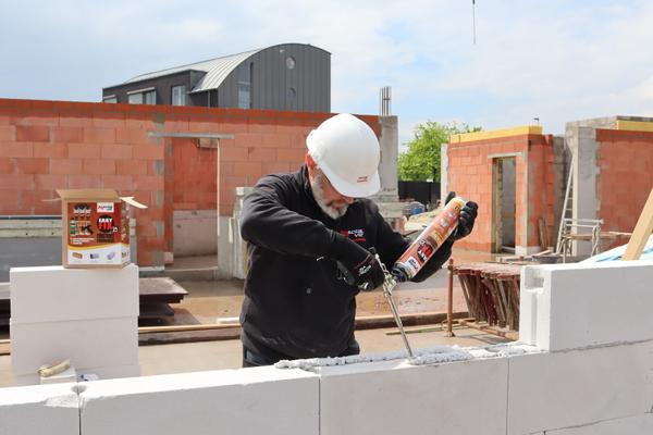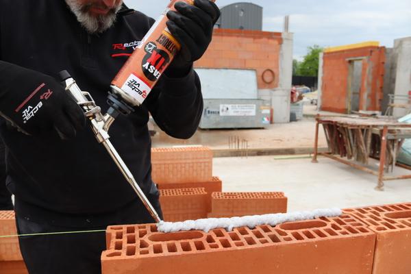 Colle mousse polyuréthane certifiée pour murs porteurs en blocs à coller calibrés céramiques (briques creuses), silico-calcaires et béton cellulaire, d'une grande précision dimensionnelle.